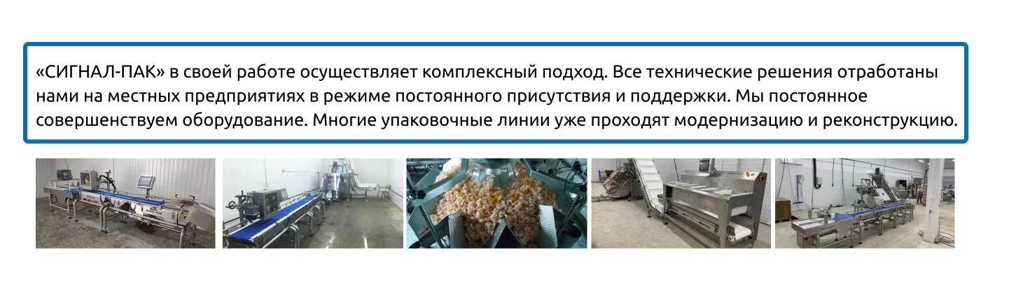 Оборудование «СИГНАЛ-ПАК» отличает: высокая эффективность, минимальное время простоев, высокая производительность. У нас большой склад запасных частей, инструментов и принадлежностей, как собственного производства, так и от поставщиков.