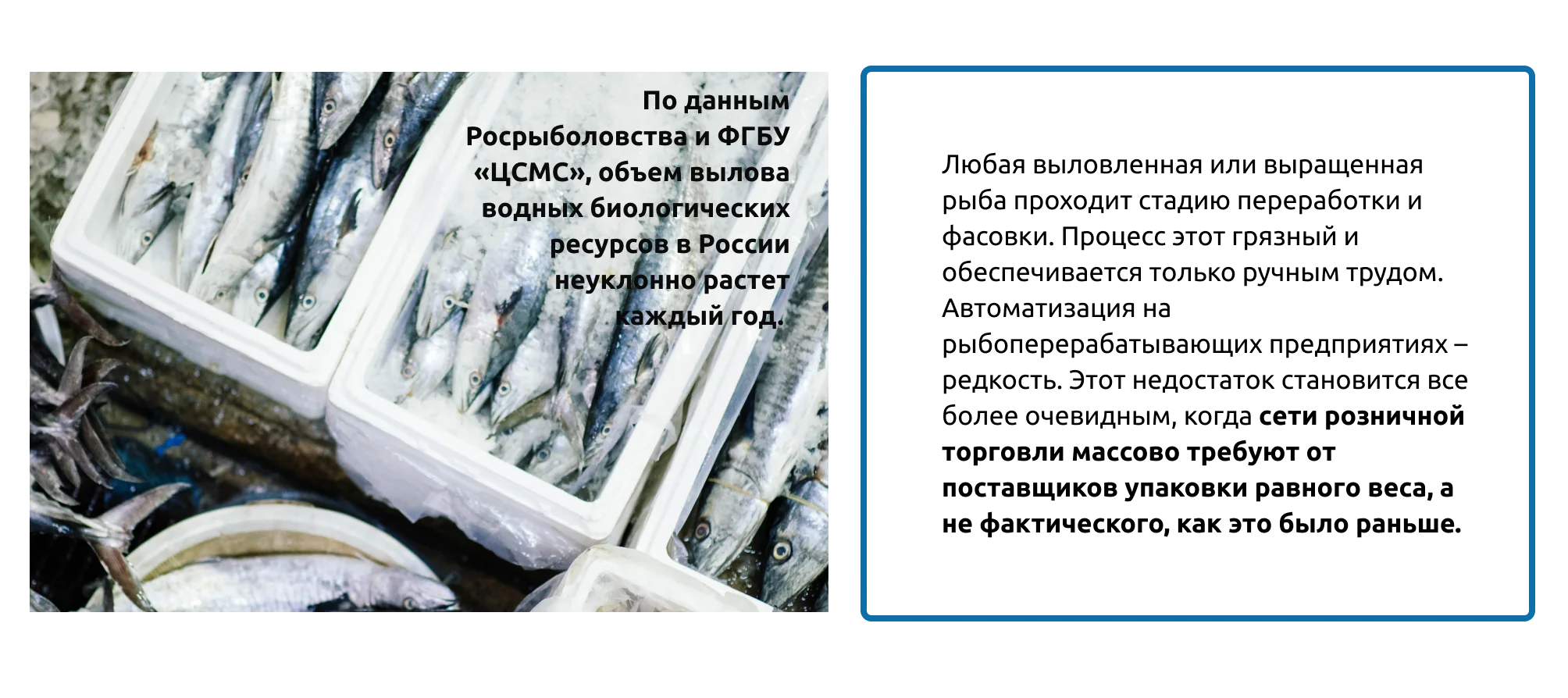 Фиксированный вес упаковки с рыбой, а, следовательно, и короба, который отправляется на продажу, позволяет ускорить логистические процессы между предприятием и магазином.