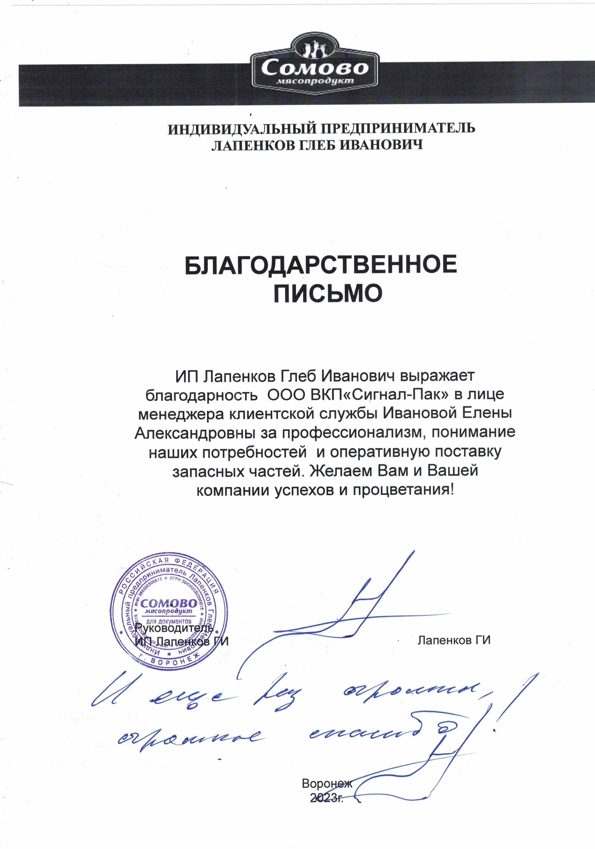 ИП Куликов Кирилл Сергеевич выражает благодарность сотруднику компании "Сигнал-Пак" Меньшикову Александру Юрьевичу за высочайший профессионализм и внимательное отношение, проявленные при наладке и подключению пельменного оборудования "Экстра-Макс"
