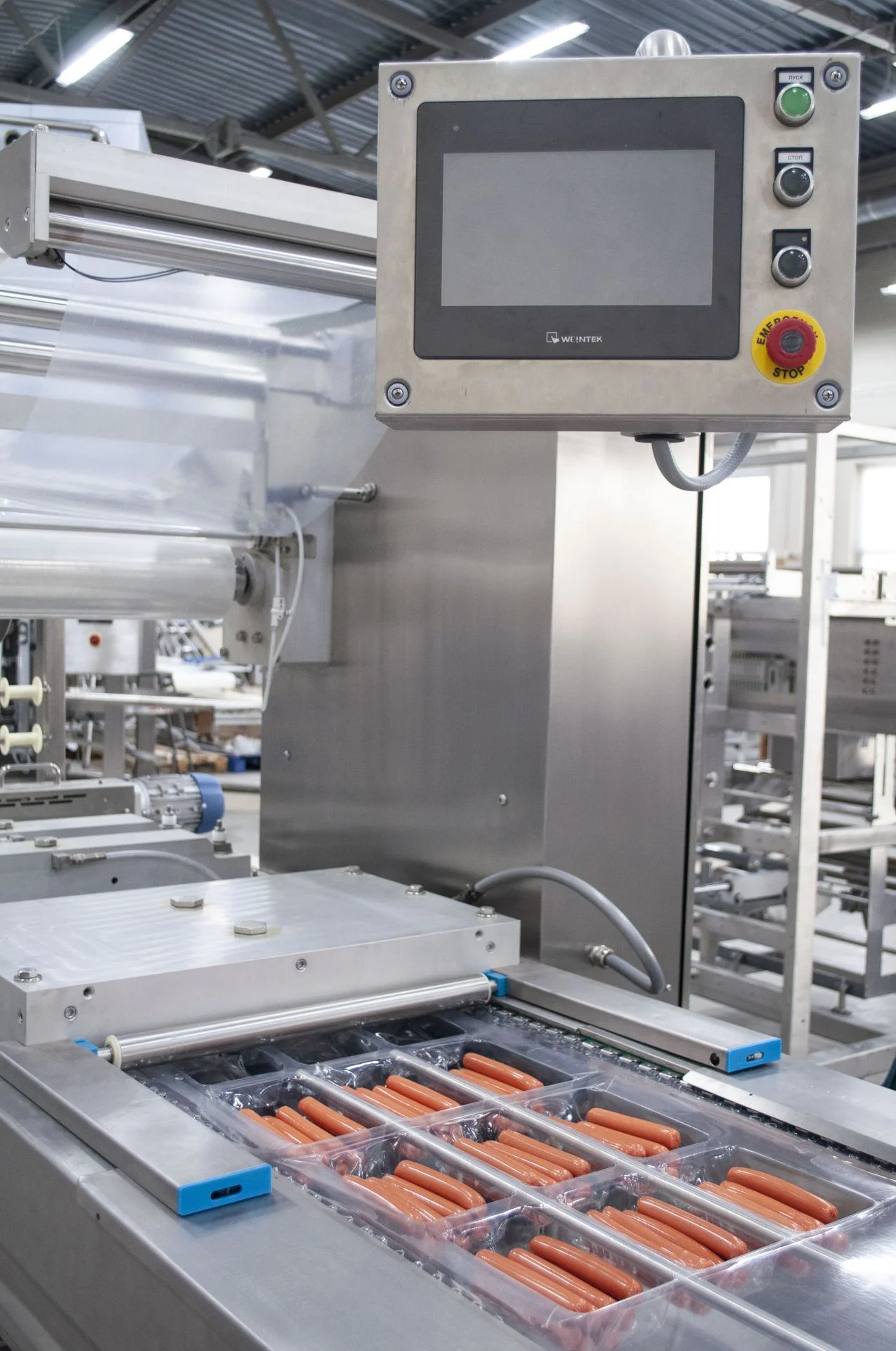 Термоформер для мяса и других продуктов надежен и практичен. Верхняя пленка может иметь рисунок, в этом случае контроль точности его позиционирования осуществляется с помощью фотодатчика. Если рисунок смещается, происходит автоматическое изменение скорости подачи верхней пленки для его выравнивания.