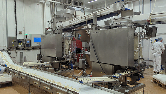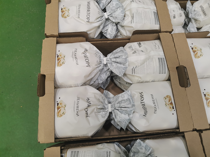 Готовую продукцию необходимо упаковать. Эту задачу решают специализированные упаковочные машины. Упаковщик пельменей формирует пакеты из термосвариваемых пленок, дозатор отмеряет необходимое количество продукции. Далее пакет заваривается и может отправляться на маркировку и групповую упаковку.